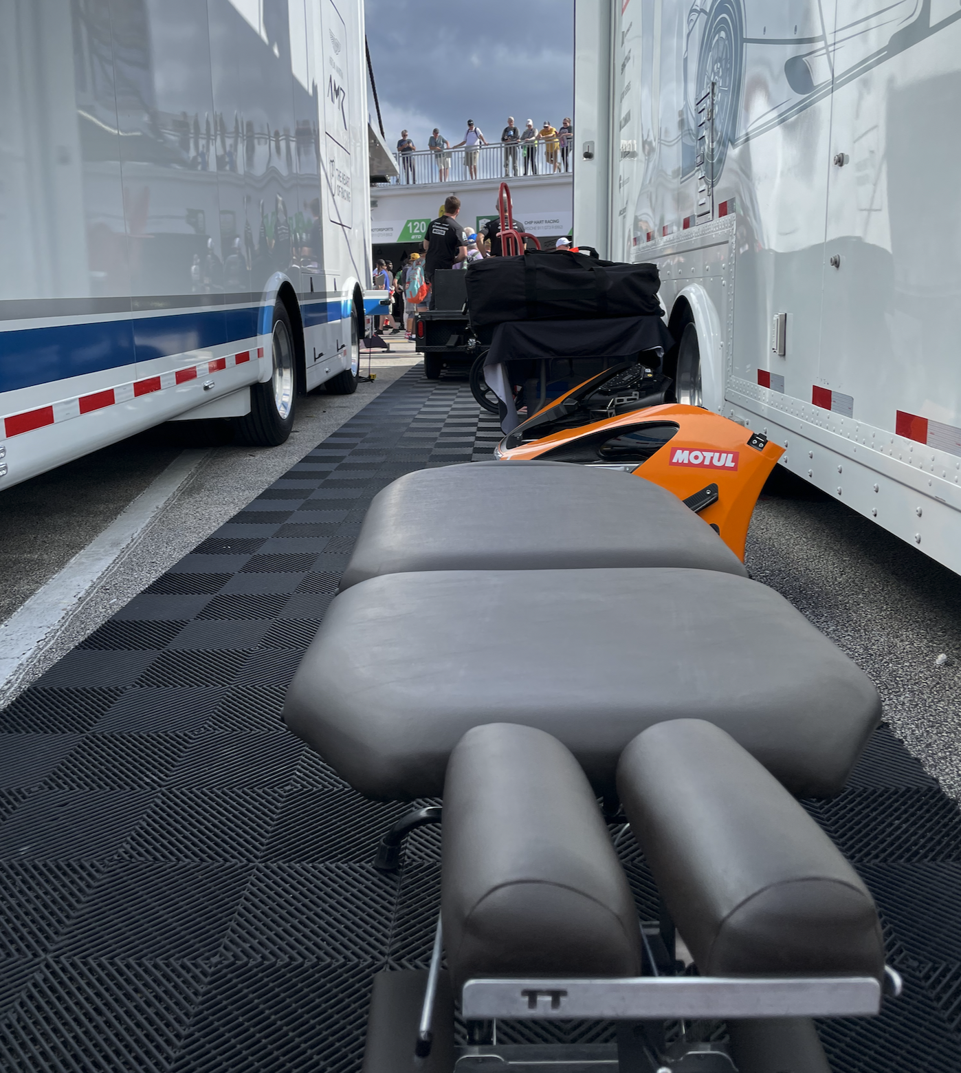 When I first arrived I was immediately met with intrigue by all of the mechanics, who were suffering with a variety of issues. Sore backs, strained leg muscles, tight and sore hands, headaches and much more. I flew out of YYZ at 6:15am and was treating my first mechanic by 11am. Races aren’t exactly private and so my table was positioned between the trailer and just in front of a spare nose for the McLaren. It wasn’t glamorous, but I loved it. High paced environments with the need for a fast diagnosis and then treat accordingly is the environment that I thrive in. Every mechanic was on a time crunch so I felt like one of the crew, except that I was the mechanic for people and not for the car.