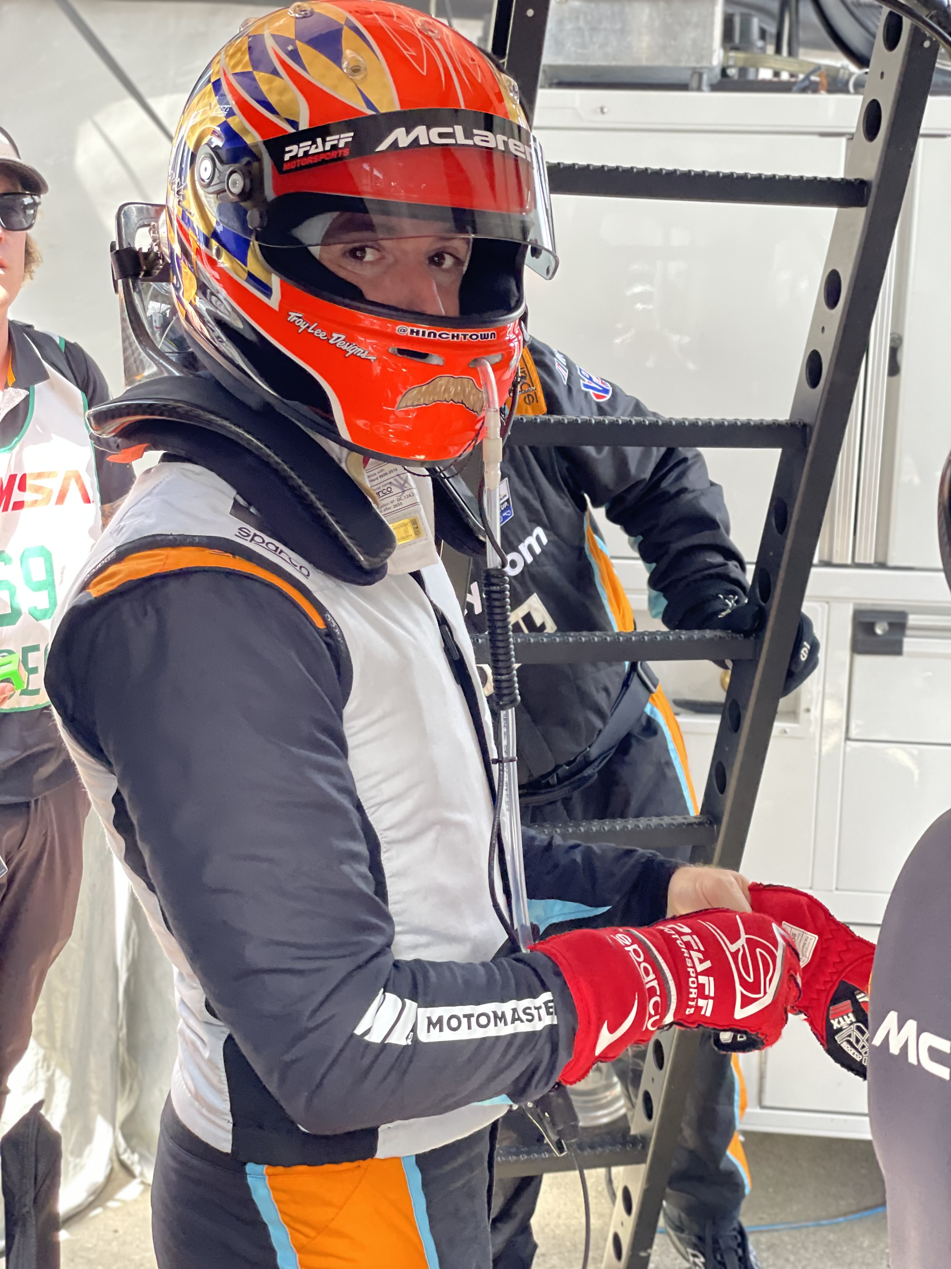 I brought along a new electrolyte drink Scratch Labs, which I used in my cycling days, as it is in my opinion one of the best on the market. Nothing extra added, and only what you need. It was a test to see how the driver’s liked it, as ultimately they are the deciding factor. Based on all the feedback I got it was a big hit, even from Marvin who is bar far the most particular individual I have met when it comes to food/drink/preparation. The second thing I asked Pfaff to order and institute was having ice vests on hand for each of the driver’s. Some race cars have AC, but the McLaren sadly does not and we have had some heat issues during mid day where driver’s get a little too hot and although are able to finish a stint, are a bit of a wreck after. I wanted to institute the ice vest for pre drive to cool them down, and have it available for after to help them recover. We only got one vest, but it fit all drivers and was a big hit throughout the weekend. See below Hinch cooling off with the ice vest on right before he hops in the car.