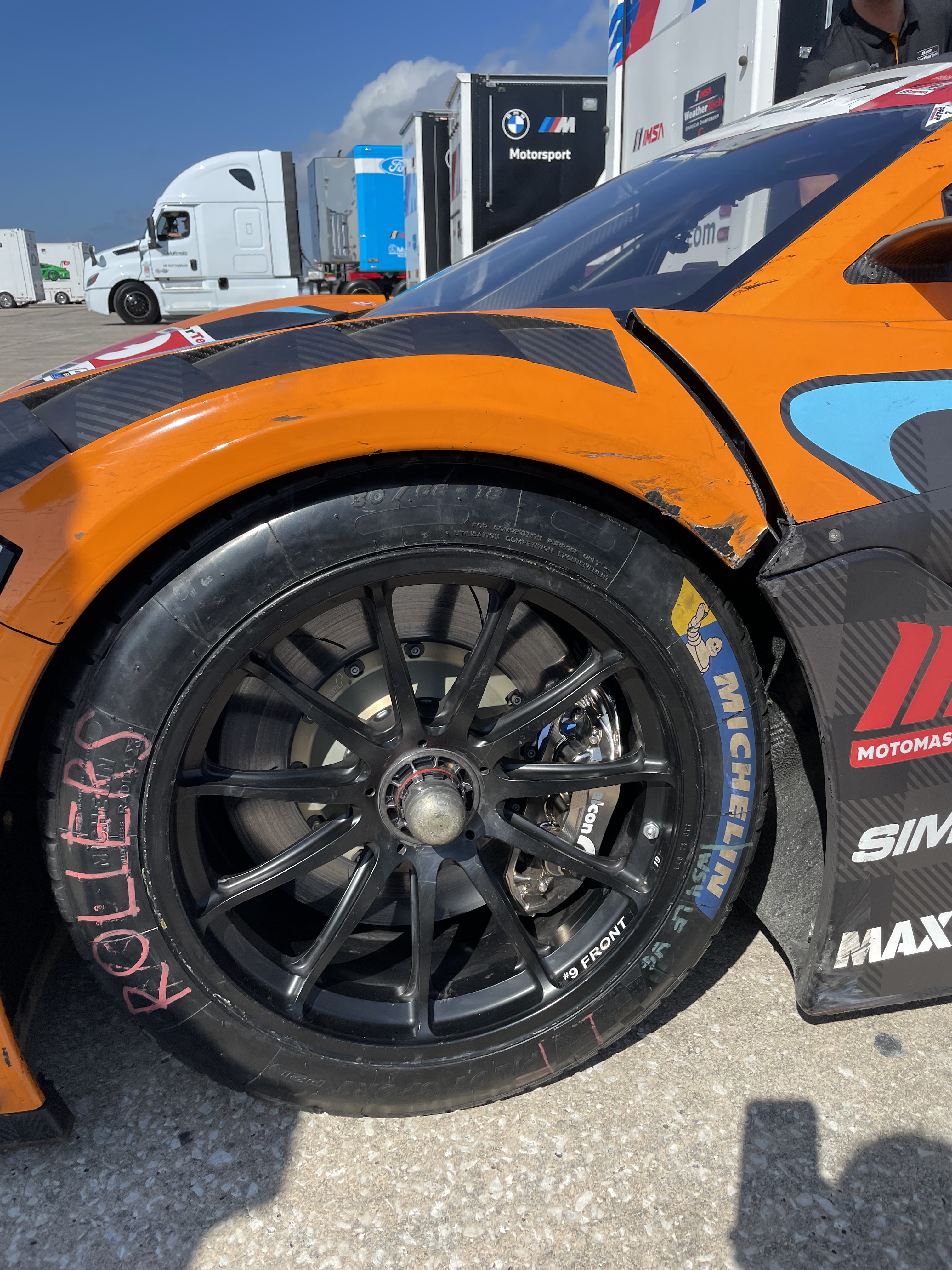 When race day came it wasn’t very long before disaster struck. I think it was all of 10sec into the start and on the first turn Oli was hit by another car, and then hit again by an errant Ferrari. This bent and tore his front wheel and tire, and also damaged some rear suspension. This meant straight to the garage and instantly we were 15 laps down. Not a great start. The race turned into a long high speed test for the team. Unlike Daytona nothing on the car broke which didn’t involve impact. Mid race we were hit again by a Lexus driven by as Bruno (team strategist) called, a Bozo driver. On a positive the team finished the race, without retirement and at times were the fastest car on track which is quite inspiring.